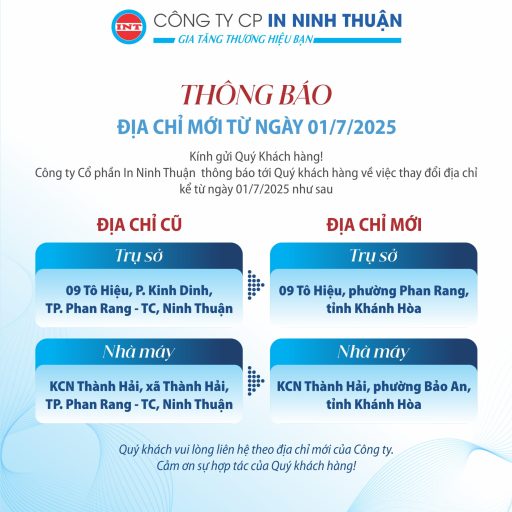 Thông báo thay đổi địa chỉBởi admin / 03/07/2025 Công ty CP In Ninh Thuận xin trân trọng thông báo đến quý khách hàng về việc thay đổi địa chỉ kể từ ngày 01/07/2025